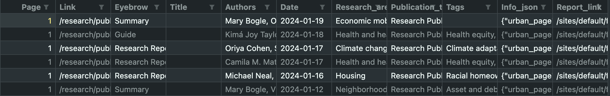 A google search and you can find similar quotes floating around the Internet since 2010. But is it true? Many of these claims are based on personal opinions and anecdotes that can hardly serve as evidence. Instead, can we use data, especially texts, to analyze the change in political spectrum over time? In this post, I will apply Natural Language Processing (NLP) methods on a dataset from [Urban Institute](https://www.urban.org/) to attempt to answer this question. The Urban Institute is a US think tank that has often been labeled as "center", "left-leaning" and "liberal" in various studies. The idea is that if we can observe a shift in political views in their reports, it may suggest a change in the geographic center of US politics. Obviously this measure is far from perfect. There are many other think tanks and organizations that need to be included for comparison. Think tanks also do not represent the whole political spectrum. But I think it is a good starting point to study the center of US politics. Maybe a better title for this post should be "Has the center gone too far left?". ### 1. Data Collection Urban Institute displays their reports in a very organized way on their [website](https://www.urban.org/research). I was able to write a simple scraper using Python to collect the information of all the reports. See below for a snapshot of the data: