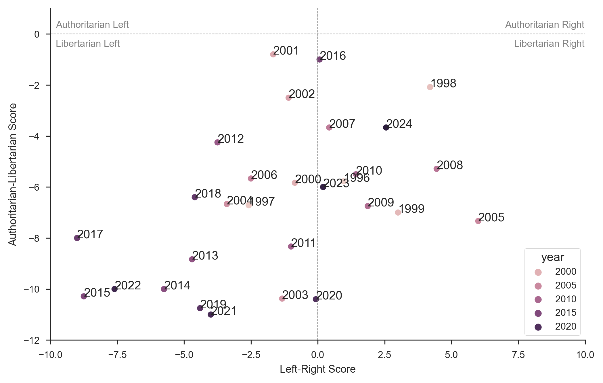 Due to legal concerns, I am not able to share the raw data here. But here is the code I used to scrape the website: - First grab the urls of to the detail pages - Then find and parse the information of each report, including title, author, date, tags, link to the pdf file, etc. ### 2. Calculate Political Orientation Once all the reports from Urban Institute have been collected, we move on to calculating the political orientation score using GPT-4 API. Each report will be analyzed by the model to predict responses to a set of political questions. Additionally, the model will determine whether each report is directly related to the questions. Only the predictions from the relevant reports will then be used in estimating the political orientation. Due to token limits, only 20 reports from each year were randomly selected for analysis. Also, a simplified version of the political compass questionnaire was used, consisting of only 8 questions. This is significantly fewer than many standard tests you can find online, which have up to 100 questions. Therefore, our model can only provide a rough estimation of the real political orientation. The political questionnaire and the corresponding political spectrum I used are as follows: Do you agree or disagree with the following statements? Economic Policy: - Government should play a significant role in regulating markets to ensure consumer protection. (Left) - High levels of taxation on the wealthy are necessary to reduce inequality. (Left) Social Issues: - Society must ensure all individuals have equal opportunities regardless of their background. (Left) - Traditional values and norms are important to maintain societal cohesion. (Authoritarianism) Foreign Policy: - My country should prioritize international cooperation over national interests. (Libertarianism) - Military force is a necessary tool in maintaining our global position. (Authoritarianism) Environmental Policy: - Strong environmental regulations are necessary to combat climate change, even at the cost of economic growth. (Left, Libertarianism) - Private sector innovation is the best way to address environmental challenges. (Right) Governance: - The government should have the authority to implement strict measures to ensure public safety. (Authoritarianism) - Individual freedoms should be prioritized over state security measures. (Libertarianism) The model is instructed to provide a response to each statement on a scale from 1 to 5, where 1 means "strongly disagree" and 5 means "strongly agree." These responses are then used to calculate scores for economic orientation (left or right) and governance orientation (authoritarianism vs. libertarianism). In our design, a score 0 should represent the middle ground of the spectrum, while negative values indicate left/libertarianism, and positive values indicate right/authoritarianism. ### 3. Results Let's see how each year's score of Urban Institute looks like on the political compass diagram: