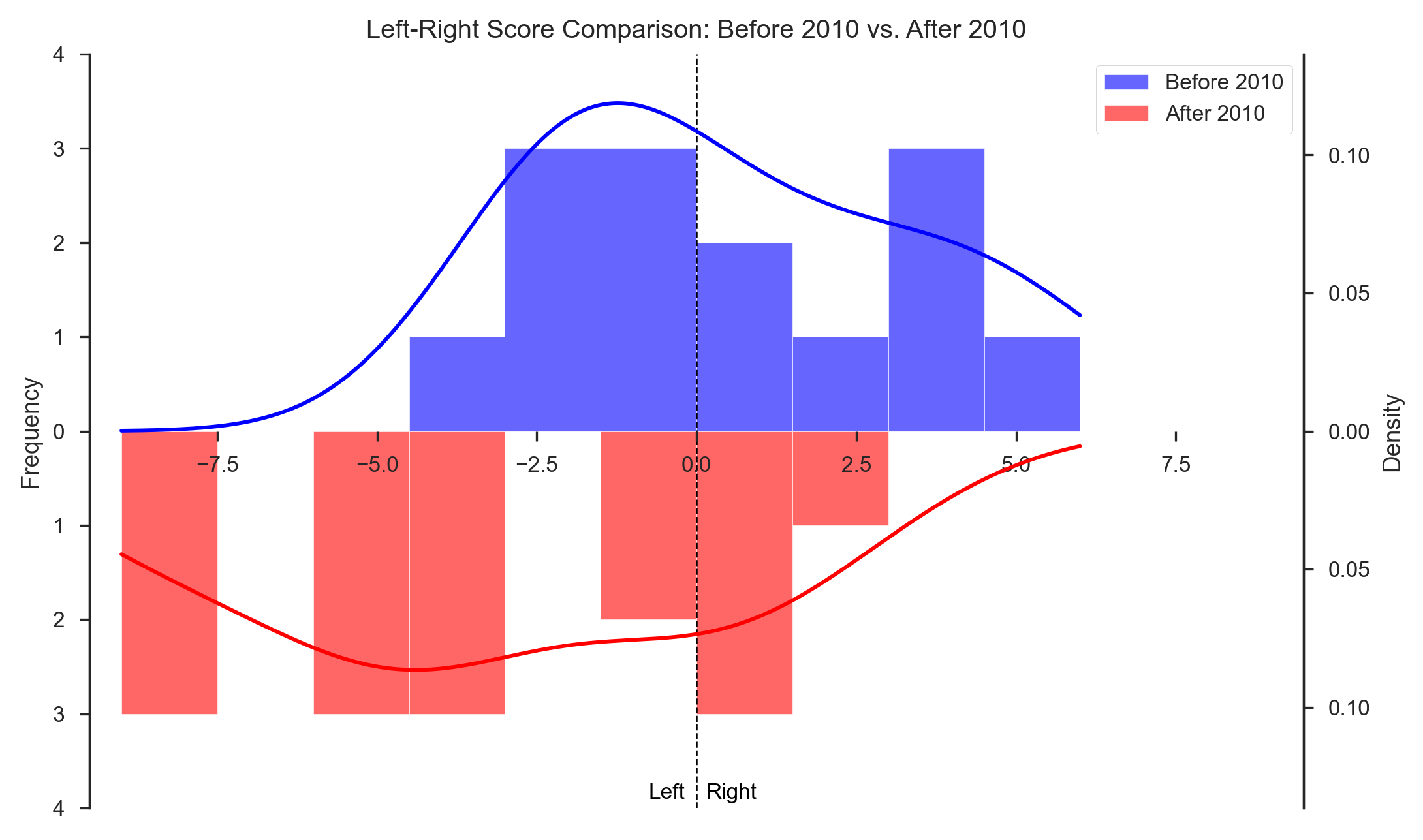 First note that our result aligns with the common belief that the Urban Institute is a left-leaning and liberal think tank. The average economic left-right score is -1.44 and the average authoritarianism-liberal score is -6.58. Observing the graph we can see a slight shift towards the left and libertarianism over time, which is the bottom-left corner of the diagram. To show the trend more clearly, I divided the years into "before 2010" and "after 2010" and compared the distributions of the scores: - Left-Right Score