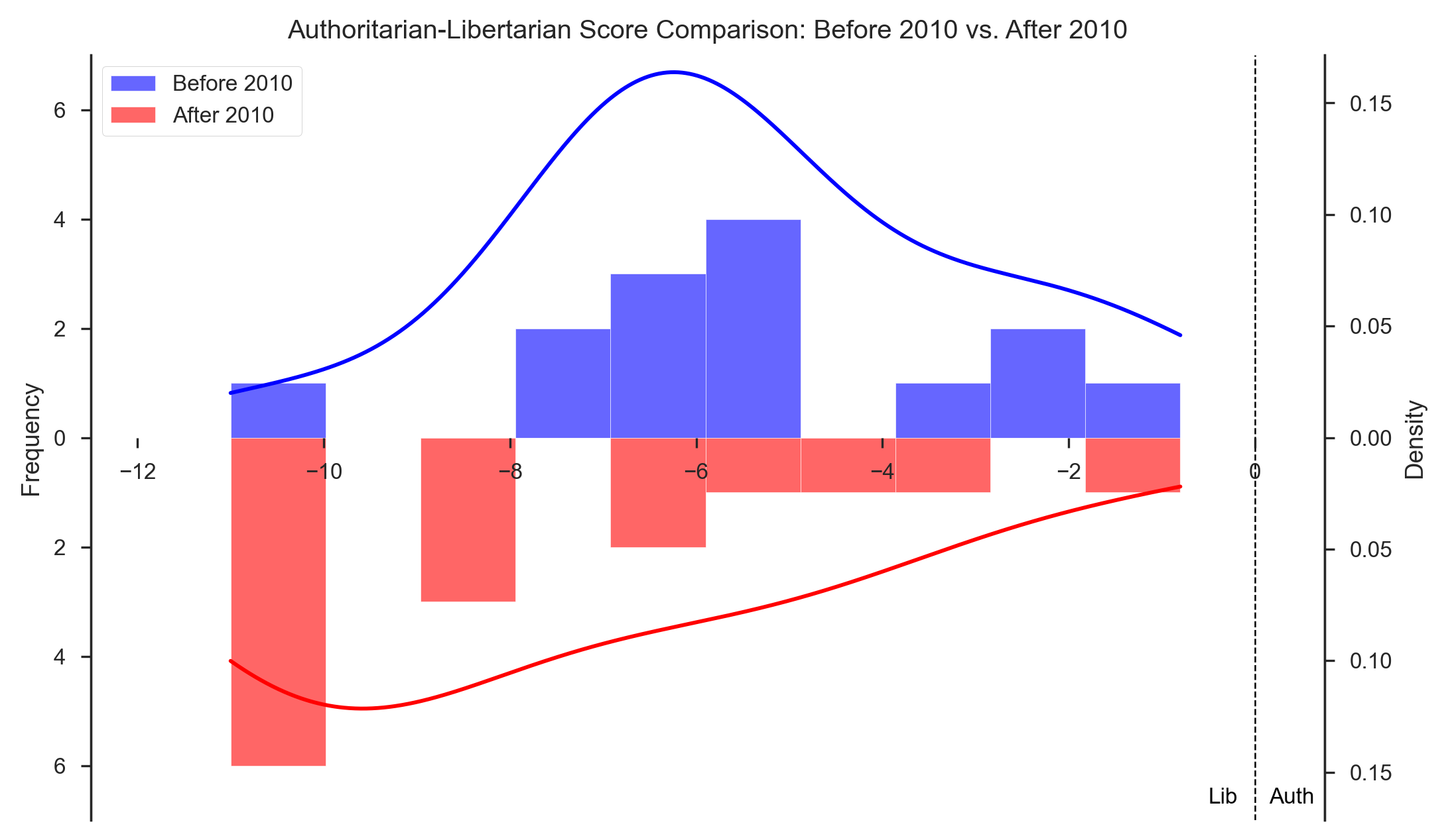 To statistically test the difference, I chose the non-parametric approach with the Mann-Whitney U test. The results show that the average left-right score is significantly different before and after 2010, with a p-value of 0.011. - Authoritarianism-Libertarianism Score